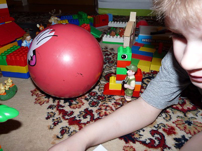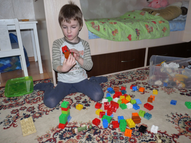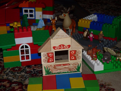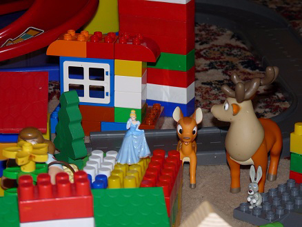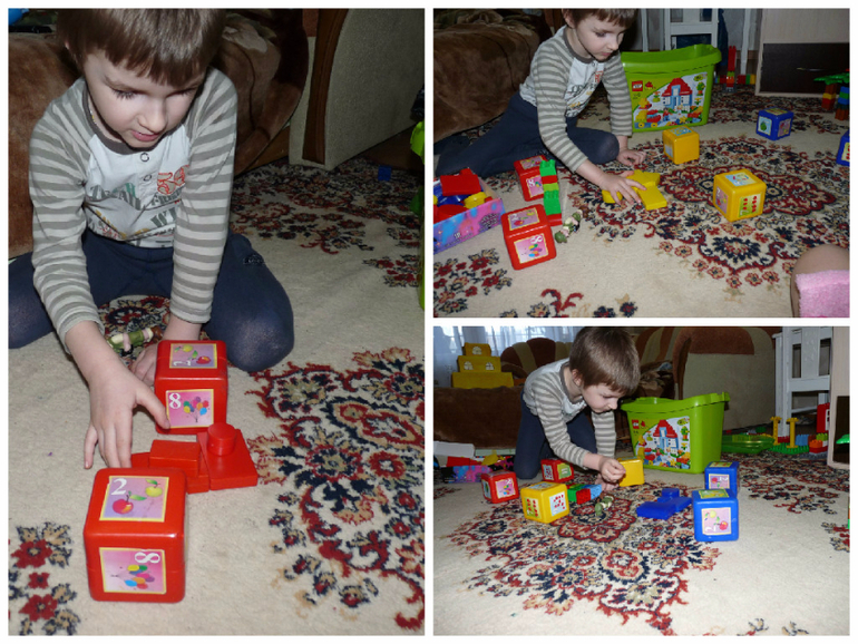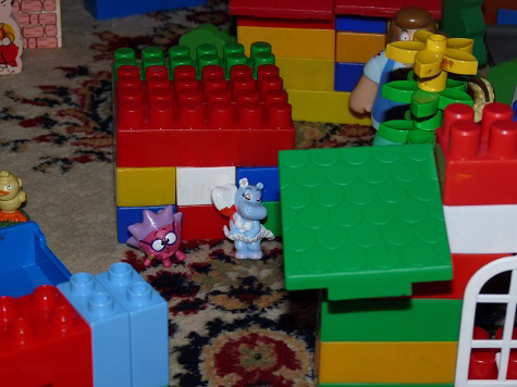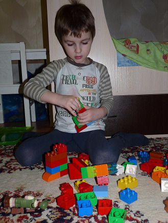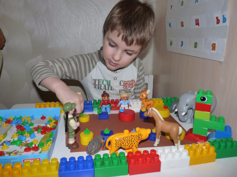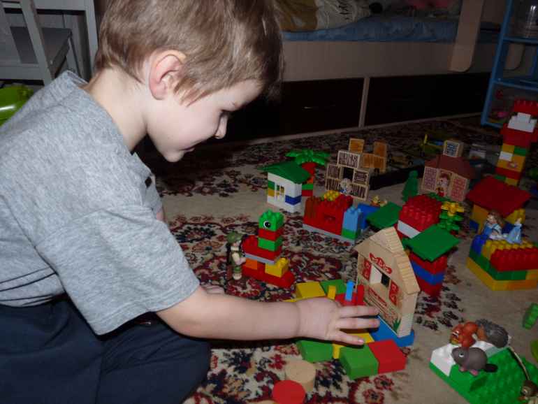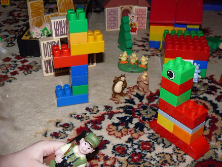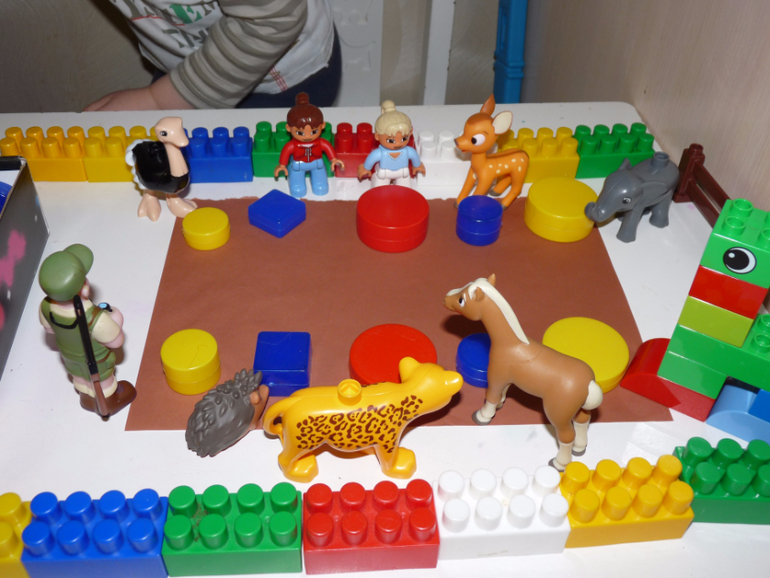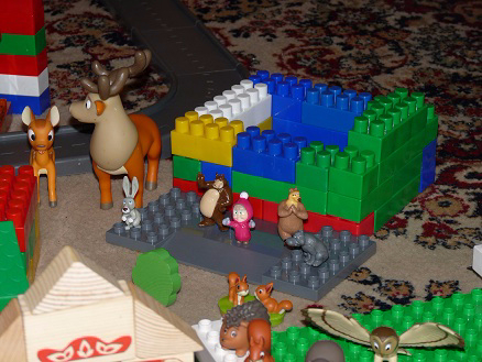 Загостились наши герои в городе игрушек, пора домой возвращаться. Попрощались они с игрушками и домой едут, видят полянка, а на ней кубики разбросаны. Вася предложил их собрать, мимо ворона летела и рассказала, что кубики эти не простые, а раньше из них целый лес игрушек был построен, а потом ураган налетел и всё разрушил. Принялись мы животных строить, Артём строил всех сам, я не помогала, поэтому кто это был, можно было только догадываться.