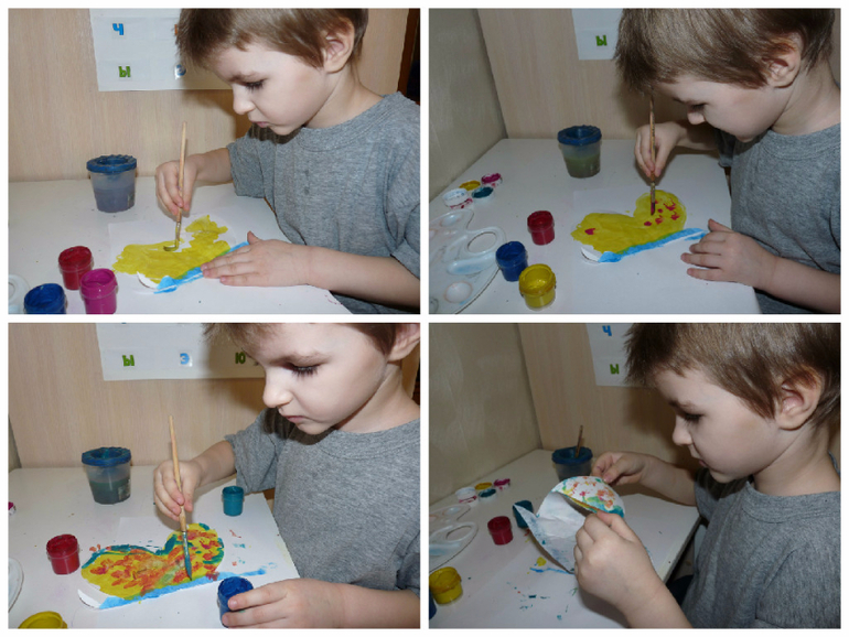И символ лета нужно сделать не забыть. Разукрасили одну сторону бабочки, сложили, но рисунок плохо отпечатался, поэтому Артём начал сверху со всех сторон рисовать, я уже не останавливала. Попробуем таким способом ещё порисовать.