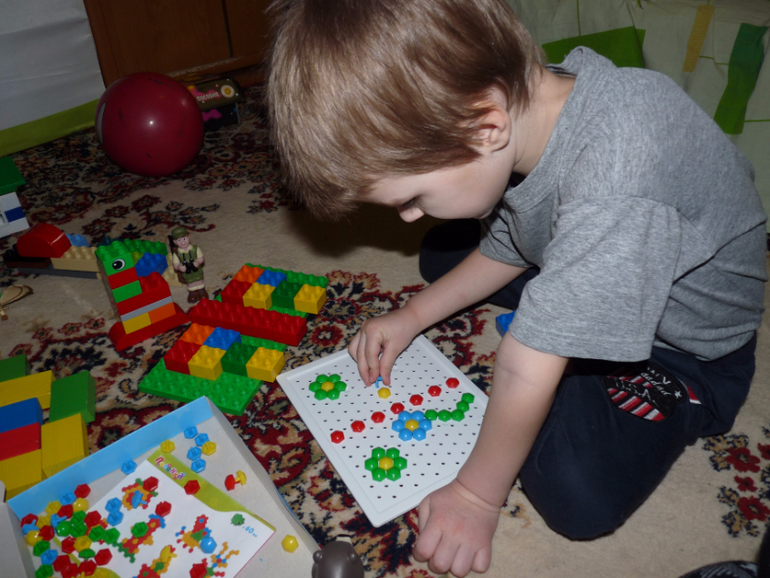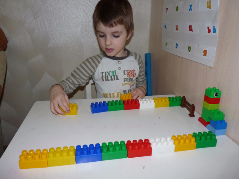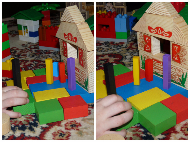 Сегодня праздник и на нашу поляну соберутся гости со всего города игрушек. Нужно нашу поляну забором огородить только забор должен быть одинаковым со всех сторон. Выкладывала одну сторону я, а со второй стороны Тёма повторил.