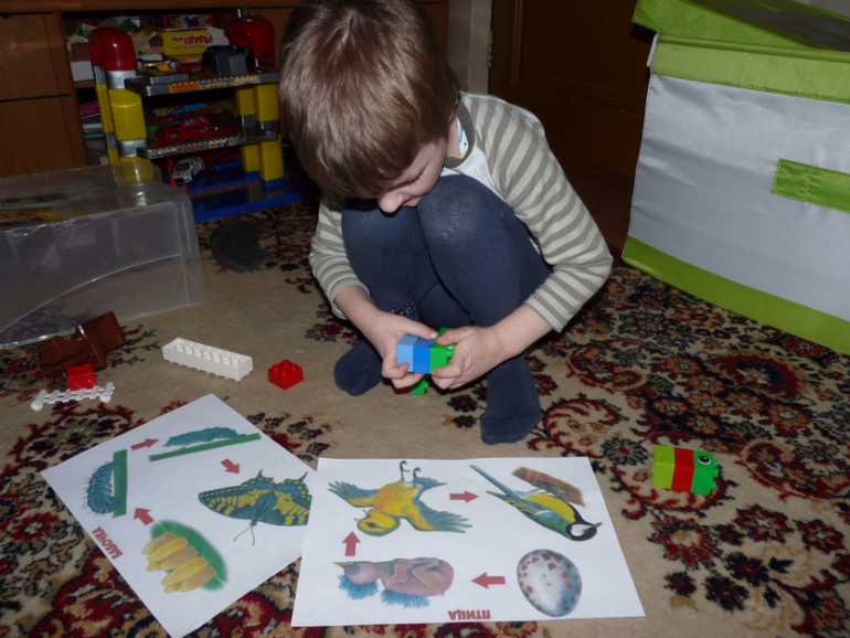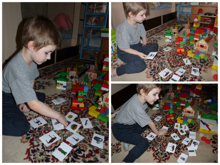 Вдруг видим ещё животных нужно собрать. Танграм давно хочу сделать, но никак руки не доходят, поэтому вырезала из картона быстро. Так как раньше мы не пробовали, то нарисовала контур схем, Артём быстро справился, ему очень понравилось. А вот одну фигуру попросила сложить по образцу, тут оказалось ему сложным, вертел в разные стороны и вскоре интерес совсем пропал, так что мы так по образцу и не собрали.
