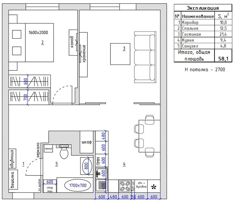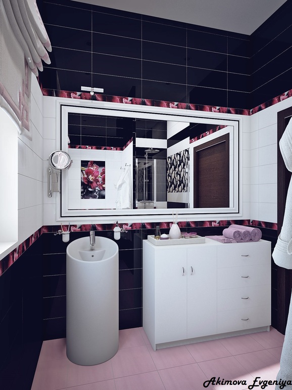 Планировка достаточно распространенная сейчас в новостройках, единственно здесь заказчики очень хотели увеличить ванну. И плюс удалось сделать небольшой шкаф для хранения всяких хоз.штук.