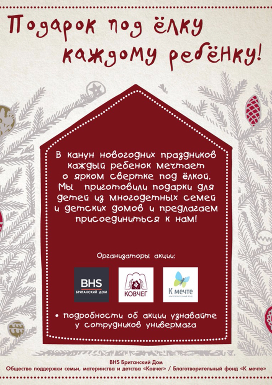 В сети магазинов BHS (Британский Дом) стартовала благотворительная акция "Подарок под ёлку каждому ребёнку"!