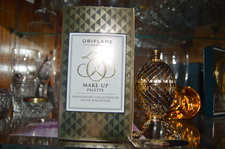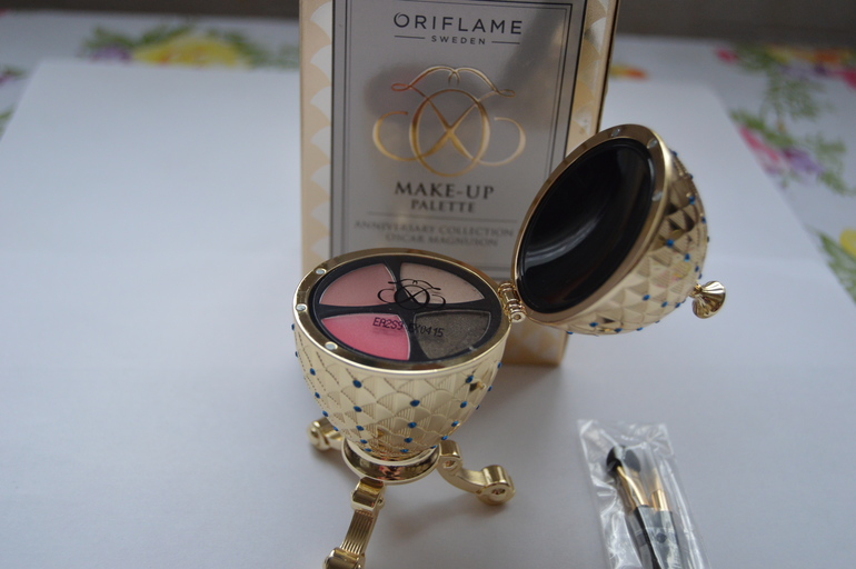 В набор входят 2 цвета теней для век и 2 цвета блеска для губ,Кисточки 2 шт.Яйцо сделано из металла и украшено стразами.Цена 2 000р.