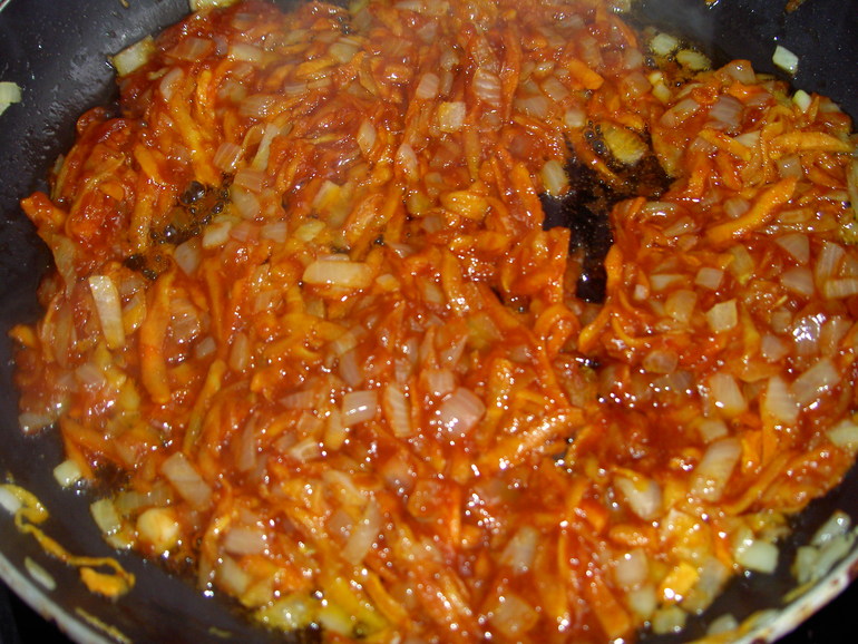 Затем добавьте томатную пасту, прогрейте пару минут и снимите с плиты.