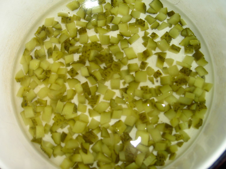 Пока варится картофель, порежем мелкими кубиками огурцы. Зальем их водой, чтобы она их слегка покрывала и прокипятим 5 минут на плите.