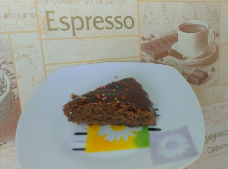 Полить остывший пирог горячей глазурью. Если хватит терпения =), подождать немного пока глазурь застынет.