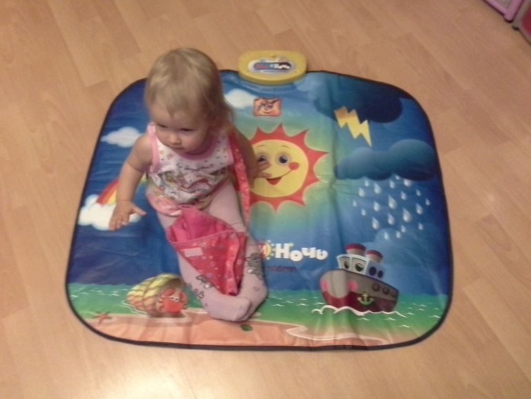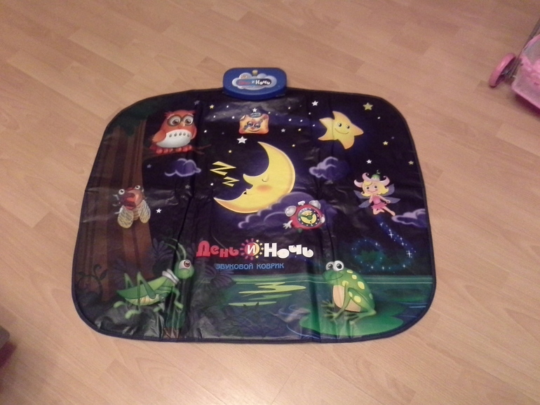 Двусторонний развивающий коврик с пластиковой консолью. На одной стороне коврика изображены явления природы, которые можно увидеть днем, а на другой - явления, которые можно увидеть ночью. Каждая картинка при нажатии воспроизводит соответствующий звук. Нажимая на картинки ручками и ножками, малыш услышит звуки окружающего мира и явлений природы.