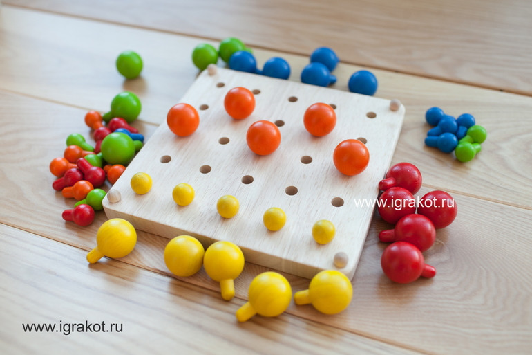 В игре крупные колышки двух размеров и разных цветов. Для начала мы рекомендуем убрать из игры маленькие колышки и научиться играть с маленькими.