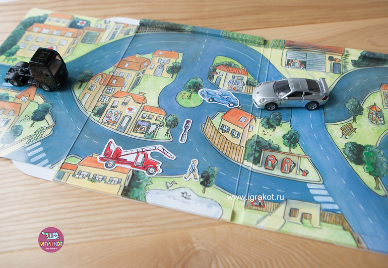 с домами, улицами, деревьями, разметкой и 70 магнитов с машинами, велосипедистами, мотоциклами, светофорами и