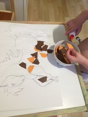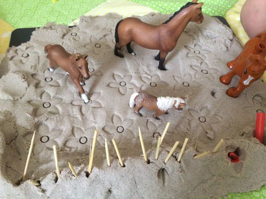 Здесь мы делали лошадкам лужайку из кинетического песка, делали отпечатки цветочков и забор из палочек.