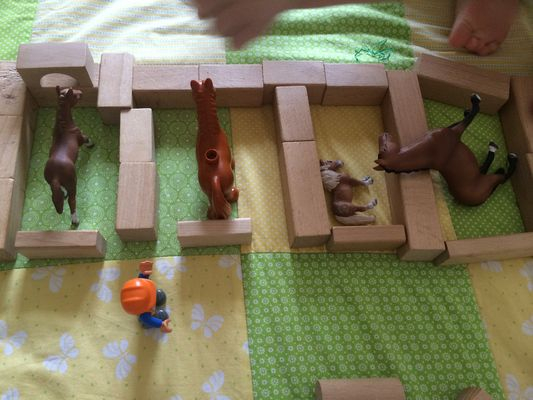Ну а здесь мы развернулись - сделали ферму с загонами для лошадей и едой, сделали озеро, куда лошадки ходили на водопой. Мне нравится, что многие вещи, которые я проделываю в ходе таких игр, через пару дней замечаю, что сын перенимает их и воспроизводит в своих затеях.