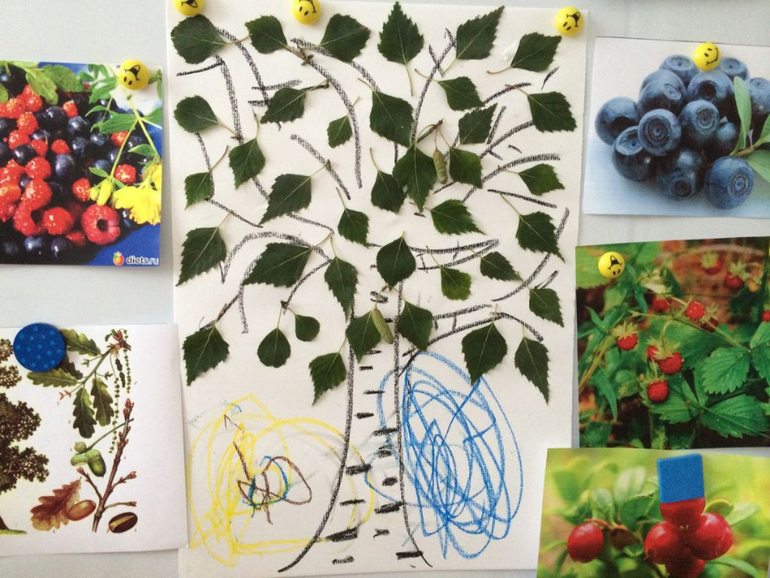 Ну и напоследок из оставшихся березовых листиков сделали березку. Саня помогал отрывать листочки от веточек, а я клеила. Для завершения композиции, Санек еще двух мышек под березу посадил - желтую и синюю)))