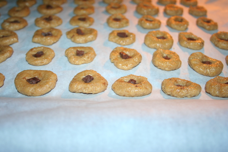 При желании на поверхности, присыпанной мукой его даже можно было раскатать и порезать формочками, но я это делать не стала и катала руками маленькие шарики, которые слегка придавливая выкладывала на застланный пергаментом противень.