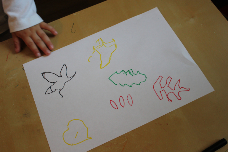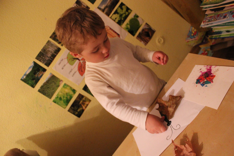 У меня был трафарет "листья". Может быть, ещё рано давать такие сложные трафареты, но я решила попробовать, тем более что и с темой совпадает. В общем, Федя рисовал листья с помощью трафарета. И вот что получилось: