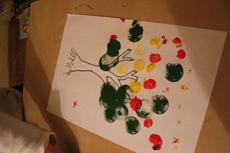 Творчество: здесь мы немного отступили от плана дня, и так как мы давно не рисовали красками, поэтому было решено нарисовать листья деревьев ... пробками. Но дома оказались только две пробки, поэтому я дала ещё и губку. Пробки использовали впервые, Федю этот процесс увлёк. Вот что получилось: