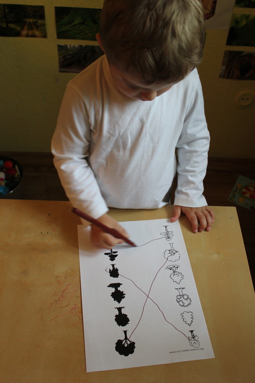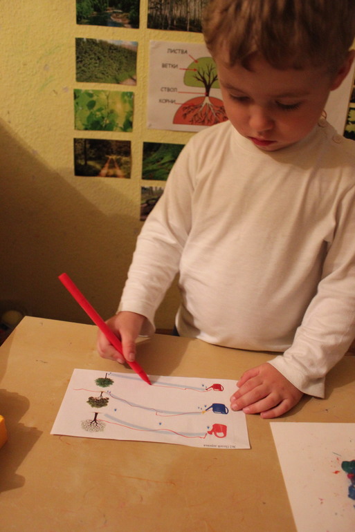 - решила напомнить про величину "толстый-тонкий". Федя находил деревья, у которых толстый ствол и соединял их друг с другом. А затем тоже самое с тонким стволом. Для меня было важным, чтобы Федя не только нашёл (в этом я не сомневалась), а произнёс антонимы - тонкий и толстый.
