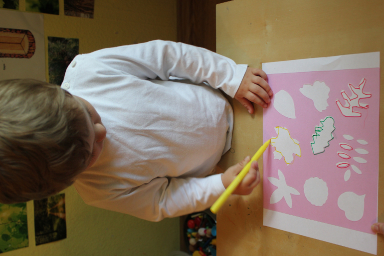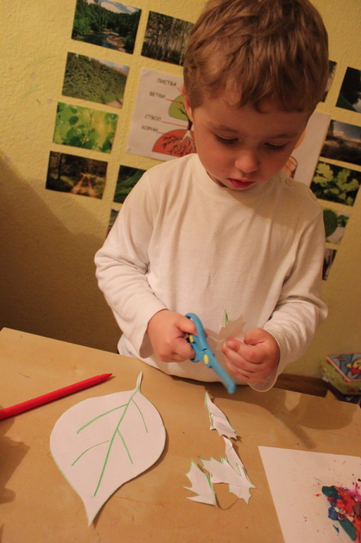 - определили, контур листьев каких деревьев нарисован. Сначала Федя нашёл их среди цветных листиков, а затем мы произнесли и запомнили их названия.