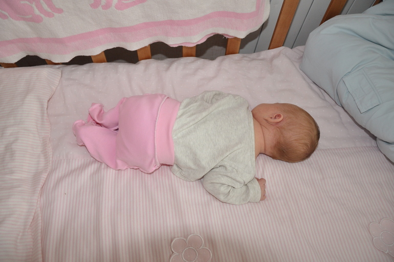 Сон. В кроватке ребенок спит только днем, ночью на мне или рядом со мной, прыгать туда-сюда мне лень. Спим исключительно на животе, на спине не получается, пеленание не признаем категорически. Для меня это дико, потому что Нинулю мы пеленали до полугода. Бодрствует до полутора часов за раз, а в сутки часа четыре получается.