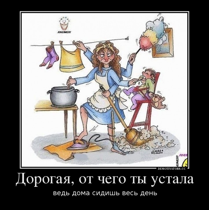 Вот меня бесят такие экземпляры:))) ничего не делаешь) ()у меня хороший муж))) Всем остальным — смотреть программу "Папа Сможет?" в интернете есть:) и читать статью: Многие проблемы в жизни людей случаются из-за головы. В голове живут странные представления, которые при использовании портят людям жизнь. Такие представления нужно выбивать из головы всеми возможными способами, за исключением, разве что, ампутации.Например, у некоторых мужчин в голове живёт интересное представление — если женщина сидит с детьми дома, то она круглосуточно отдыхает и расслабляется.Через это мужчина ожидает, что жена встретит его с работы счастливая и бесконечно отдохнувшая, свежая, весёлая, где-то даже уставшая отдыхать. Встретит, понятно, идеальным ужином и омоет ноги, по древнегреческой традиции. Ладно, про ноги я погорячился, но в остальном — нет.И мужчину где-то можно понять. Он впахивается на работе, большую часть денег от этого впахивания тратит не на себя лично, а на жену с детьми, и полагает, что заслужил пиетет со стороны жены. Вот, цитата: «Что ей, сложно, что ли? Я пришёл домой — встреть меня, как полагается!»А поскольку женщина ничего из вышеописанного не делает, мужчина в трагедии и замешательстве. Выходом из которого очень легко может стать решение: «Она меня не любит, она меня не ценит, в этом доме нет любви!». Ну а дальше — любовница, развод, трудности в общении с детьми и так далее, так далее, так далее.Всего этого можно избежать, если смотреть на мир трезво (или, по-другому, поставить когнитивный барьер).Трезвый взгляд покажет нам важные моменты. А именно — сидение в декрете является тяжёлейшим испытанием, куда более трудным, чем работа.На то есть минимум четыре причины:1. Ты ничего не контролируешь. Для счастья человеку очень важно контролировать свою жизнь (подробнее — здесь). Контроль над собственной жизнью (подчёркиваю — над собственной) напрямую влияет на здоровье, счастье и жизненный успех человека. А что такое контроль? Это принятие своих решений и следование им.У женщины, сидящей в декрете, крайне скудный выбор возможностей для принятия своих решений и следования им. Вот задумала она в обед, пока ребёнок спит, поделать упражнения на пресс. А ребёнок р-раз — и не заснул. Вроде и гуляли, и ели — а ребёнок не спит, гулит себе счастливо.Или вот — решила женщина позвонить подруге, пока ребёнок занялся погремушками. Только начала разговор, как тут — трах! бах! Что сломалось, ребёнок в плач, надо спасать.Такого в жизни женщины в декрете в разы больше, чем у мужчины на работе, и это ужасно утомляет.2. У тебя нет результата. На работе — сделка, пойманный преступник, закрученный кран, пройденный маршрут, а дома — ничего. Женщина помыла посуду — через полчаса опять накопилась гора в мойке. Протёрла пол — опять дети разлили молоко и размазали пластилин. Никакого результата.Более того, часто женщина и вовсе не может довести дело до конца. Достала бельё из машинки, не успела разложить — надо сменить подгузник. Сменила — не успела вернуться к белью, потому что ребёнок попросил есть. Накормила — ребёнок просит поиграть, как тут откажешь? В итоге — лежит себе бельё в тазу, сохнет, как умеет.А когда нет результата, не происходит «дофаминовое подкрепление». Проще говоря, организм не получает награждения за свою работу, и любимое психологами оперантное обусловлива