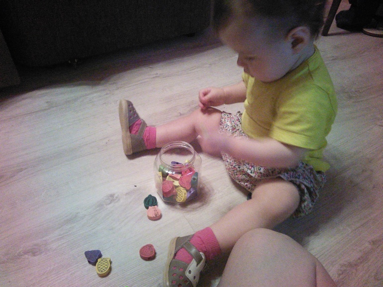 Ну про развитие. Говорить вроде стала больше, но всё слогами. Когда говорю иди буль-буль, сама голышом шлепает в ванну))). Кстати научилась и молнию на одежде расстегивать. Поэтому от раздевпния спасают только щастежки на спине или плече. Пытается заниматься созданием потихоньку: " рисует", строит башенки, пирамидку, если не по порядку, собирает на раз-два. Может прибираться, но не долго, раскладывает вещи по ящикам, потом правда всё оттуда выкидывает. Стала подпевать песням, иногда мы с ней дуэтом поем "пьяные песни о нелёгкой женской доле". Танцует ещё и головой. Залезть пытается везде, жить стало страшно. Ах да, показывает: глаза, нос, рот, уши, язык, волосы, ручки, ножки, живот и пуп.