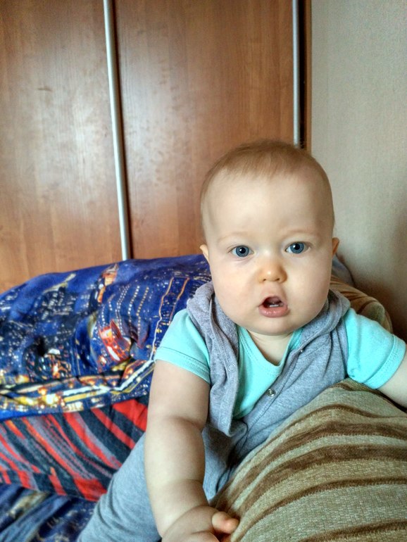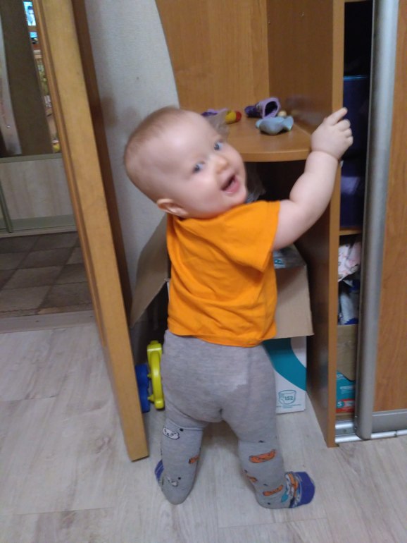 Сидит, ползает, встаёт, ходит у опоры, часто на носочках. Без опоры не стоит и ходить пока не собирается. За руки тоже ходить не хочет. Его вполне устраивает ползание и ездить на руках. На руки просится лучше чем кот из Шрека. Делает при этом очень трагическое лицо. Не пожалеть может только папа.