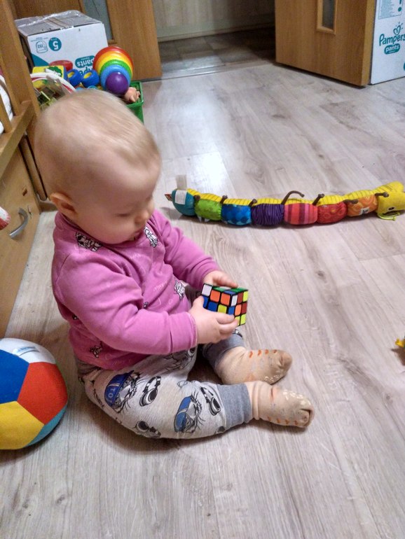 В целом парень общительный и позитивный. Может поиграть и один. Любит когда его передразнивают. С Олесей любовь, но игрушки врозь. Может тпросто смеяться когда она бегает. А может и толкнуть, если нужную игрушку защищает.