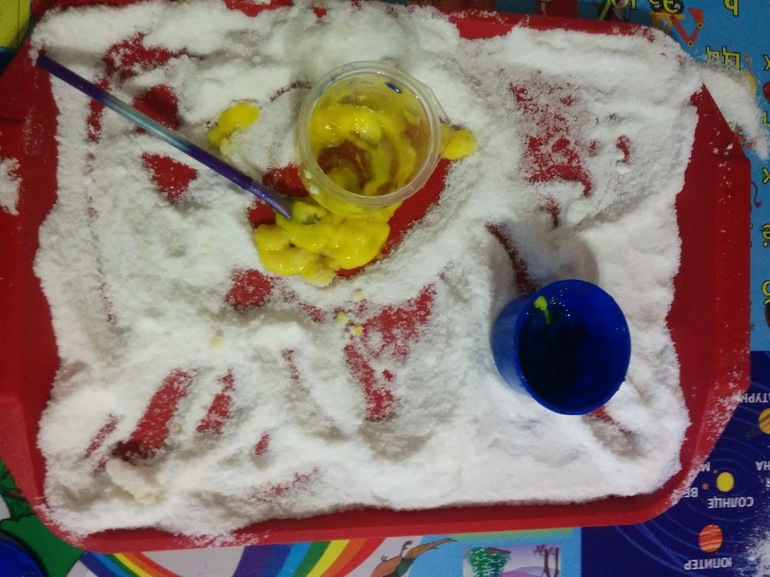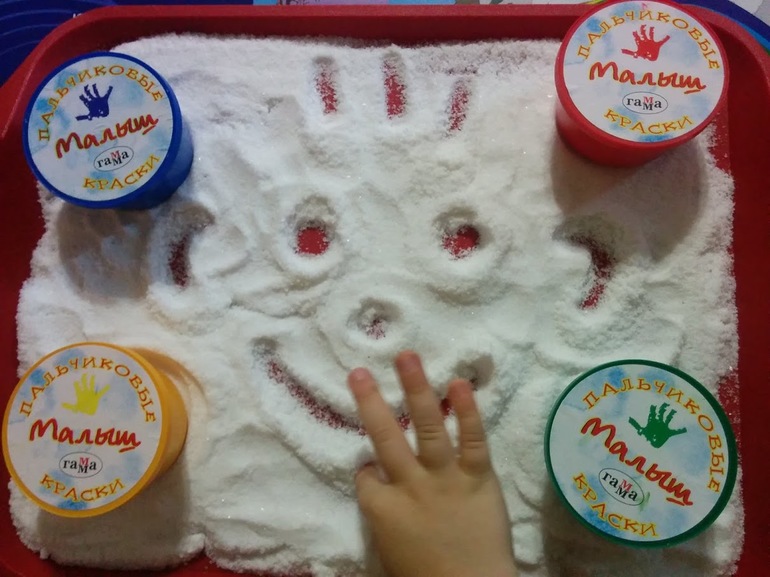 В соль добавляли пальчиковые краски и размазывали это дело по подносу)) Катали там машинки, высаживали овощи из полимерной глины и отправляли лего-человечков собирать урожай)))