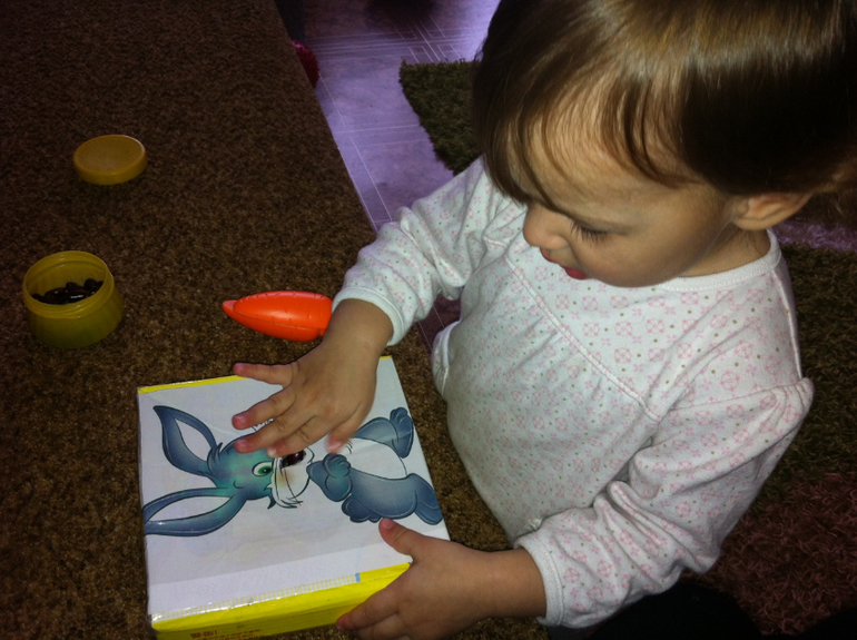 Вот эту потешку я вообще не знала. Но я ей показала другую тоже про зайчика, а эту мы просто прочитали.