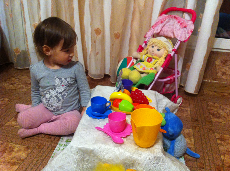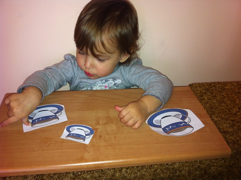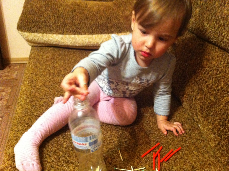 Поджигали печь. Бросали спички и красные трубочки в бутылочку. Пошли пить чай, воду я не рискнула доставать, поэтому просто разложи чашечки по размеру.