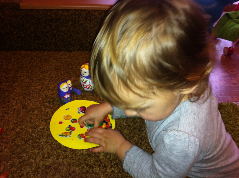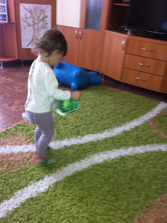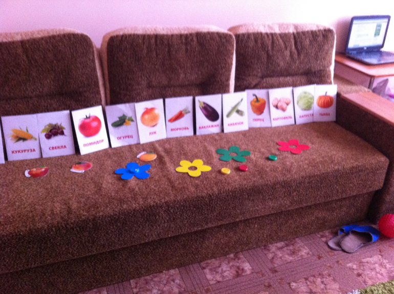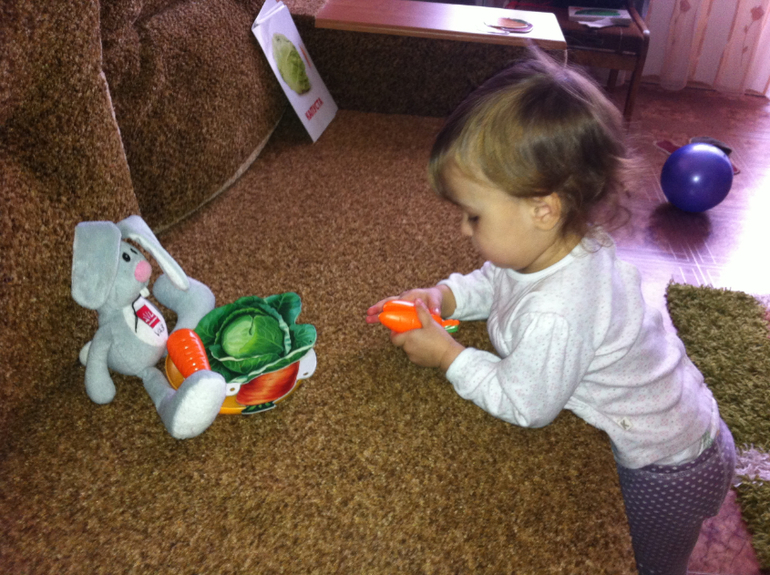 Нашли что любит зайка, с моей помощью. Она знает, но из такого количества овощей не смогла найти. Покормили зайку, и пошли танцевать с зайцем и капустой.