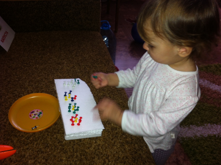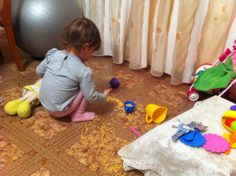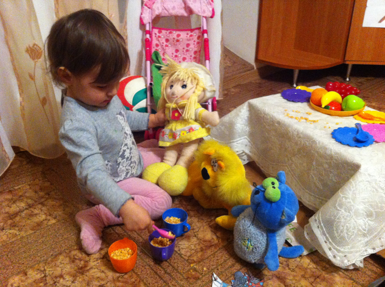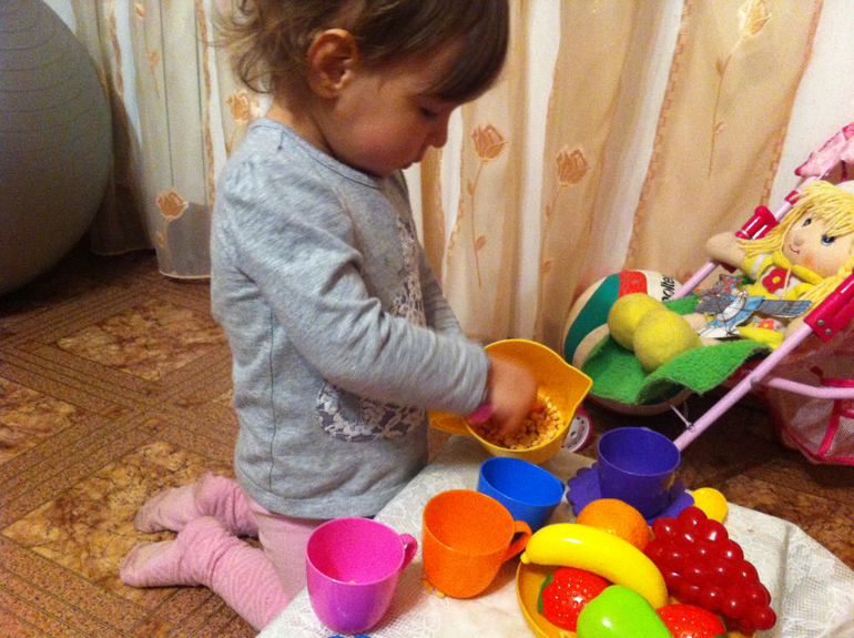 Надя хорошо знает эту потешку, сама показывает, пальчики загибает. Пошли мы в гости сороки на угощения. Надя помогала варить кашу, всех зверей угощала,ну а потом эта каша убежала)))(рассыпалась по всей комнате)
