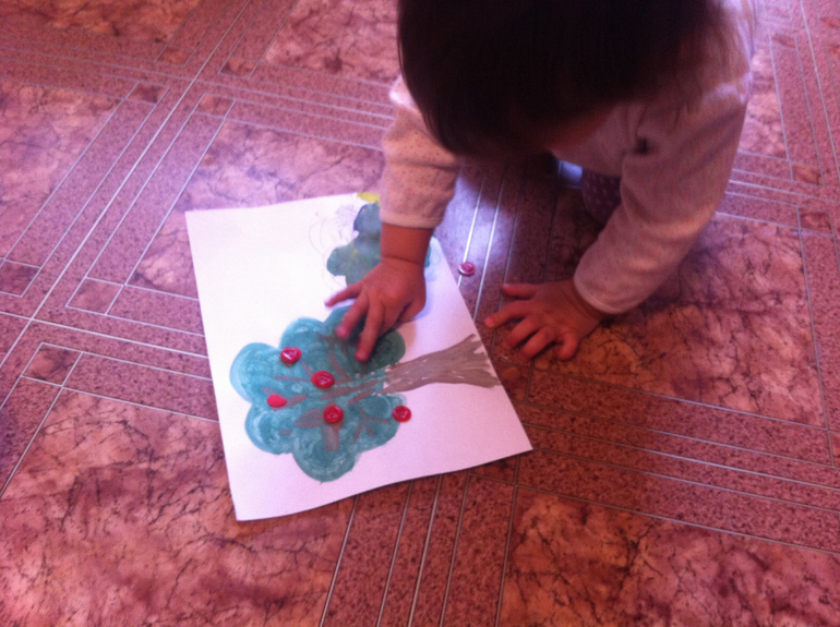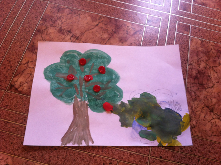 На по следок нарисовали дерево с зайцем (там где синее пятно -это Надя рисовала зайчика) и посадили яблоки на дерево с помощью пластилина и пуговиц.