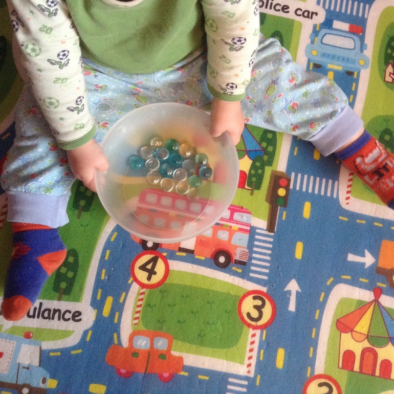 1. Дала Женечке стеклянные камушки прозрачные чтоб он их потрогал и перебирал, ему этот процесс понравился , он их разбрасывал по всей комнате а я естественно собирала )))