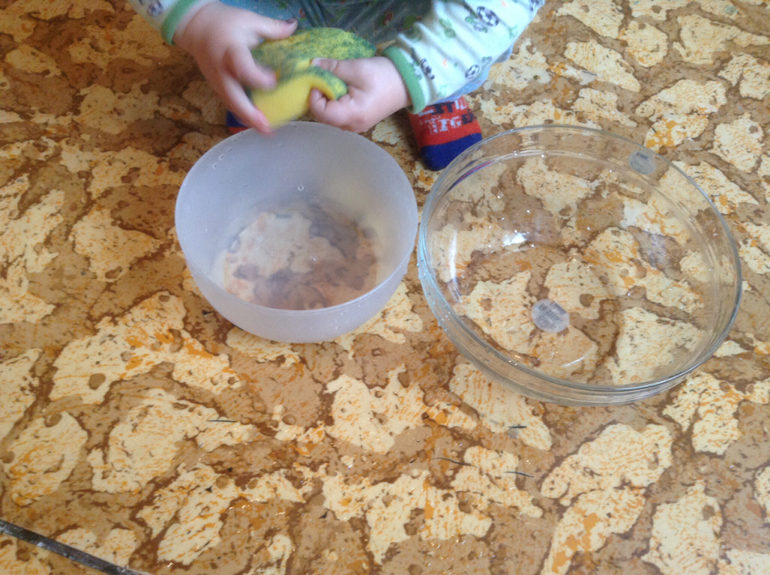 9. Потом мы делали лужи и дождик. Переливали воду губкой из одной миски в другую. Лужи реально получились настоящие ))) Сынок был доволен , тоже понравилось это занятие , сообразил как надо действовать. Один раз показала и все процесс пошел !!!