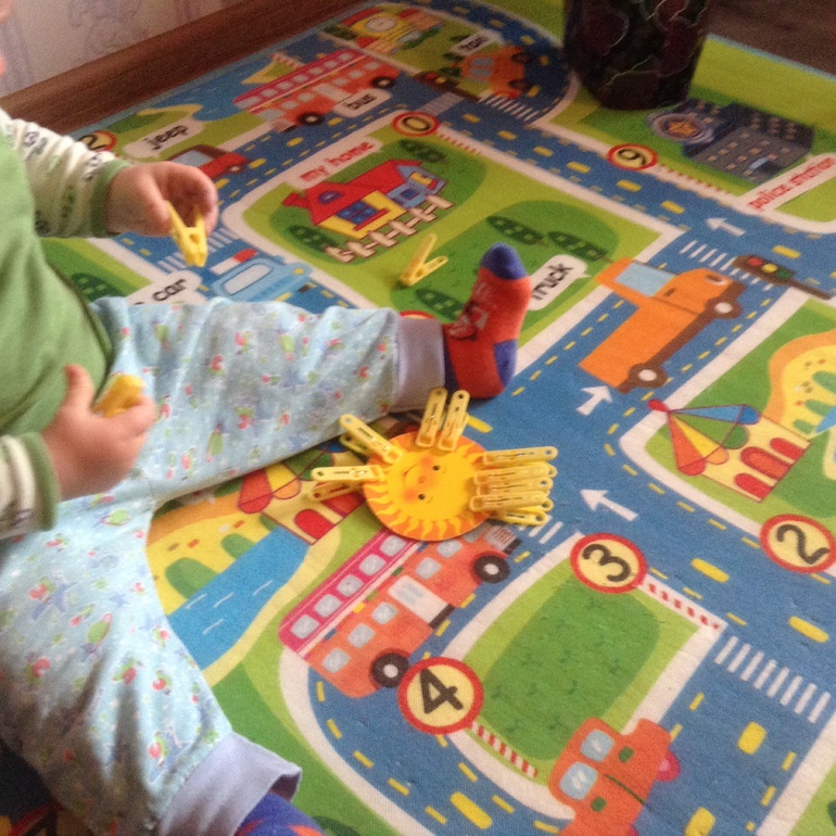 4. Потом мы взяли солнышко и стали прицеплять лучики для солнышка , ну конечно же мы это делаем в первый раз и сынок снимал прищепки а я вешала. Было забавно .