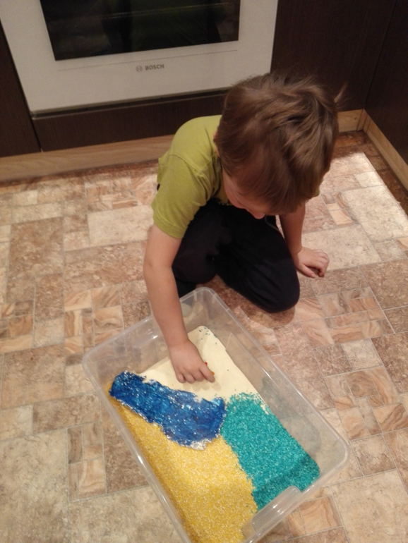 Из необычного - сделали сенсорную коробку. Река: покрасили фольгу синей гуашью; оазис: покрасили рис зелёнкой - прочитала, что это самый быстрый способ покраски, и точно, ничуть не пожалела об этом эксперименте, единственное, руки все-таки измазала в зеленке изрядно; саванна - кукурузная крупа; пустыня - манка. В общем, израсходовали наш домашний запас круп. А после была приятная для меня неожиданность - думала предложить заселить нашу Африку фигурками животных, а сынок предложил вылепить из пластилина обитателей Африки (раньше не любил играть с пластилином). Лепила в основном я, сын вылепил змею, для нам это просто огромный прогресс. Так у нас поселились две змеи, скорпион, верблюд с наездником 😀 Сын еще предлагал слепить слона, зебру и иже с ними, но я была вынуждена ретироваться на диван, поэтому предложила ему поиграть с покупными фигурками животных.