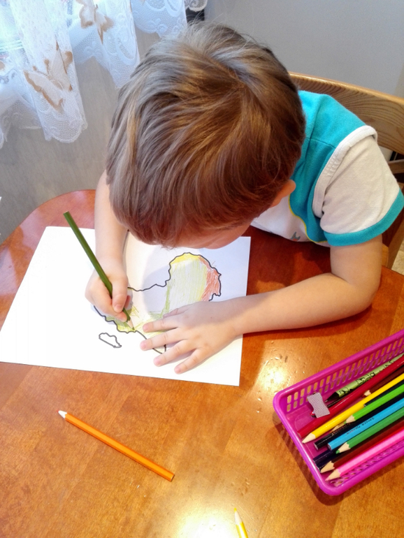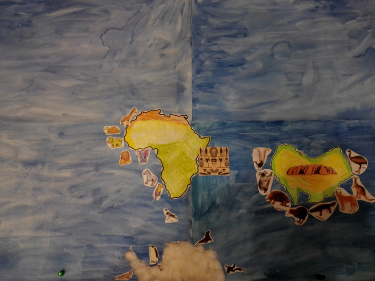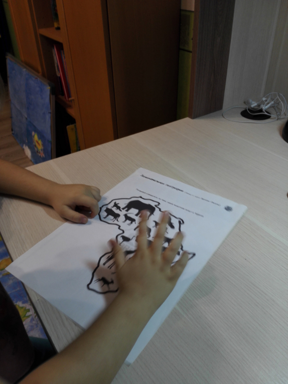 Итак, несмотря на то, что делали мы все по минимуму, все равно урок растянулся на два дня. Традиционно начали с просмотра карты, с удовольствием по ссылке посмотрели видео, в сжатой форме дана самая важная информация по материк; почитали энциклопедии и приклеили наклейки с животными. Также разукрасили карту Африки и поместили ее на нашу карту.