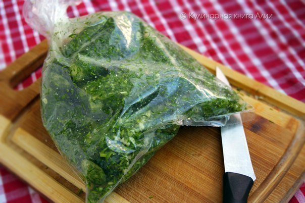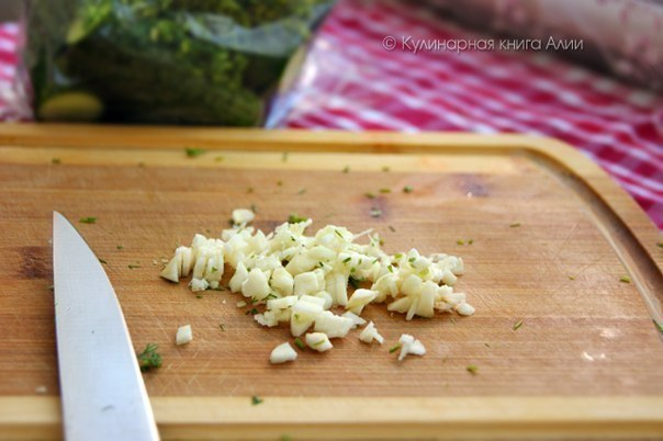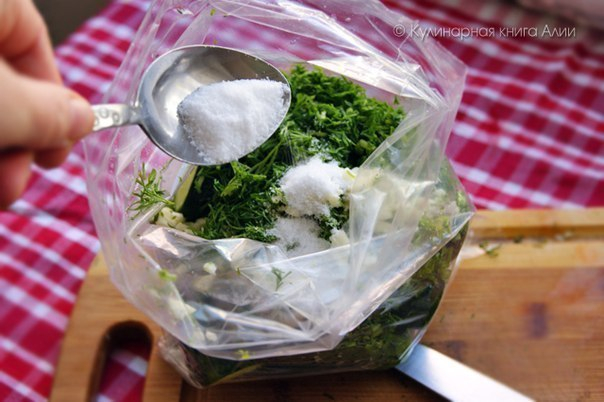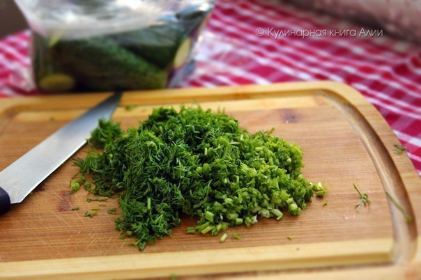 После чего мелко нарезала 3 зубчика чеснока и пучок небольшой укропа. Сложила огурцы в пакет, добавила чеснок и укроп и 1 ст. л соли. Завязала пакет и все перемешала. Положила в холодильник и раз в час перемешивала еще раз. Через 6 часов все готово.