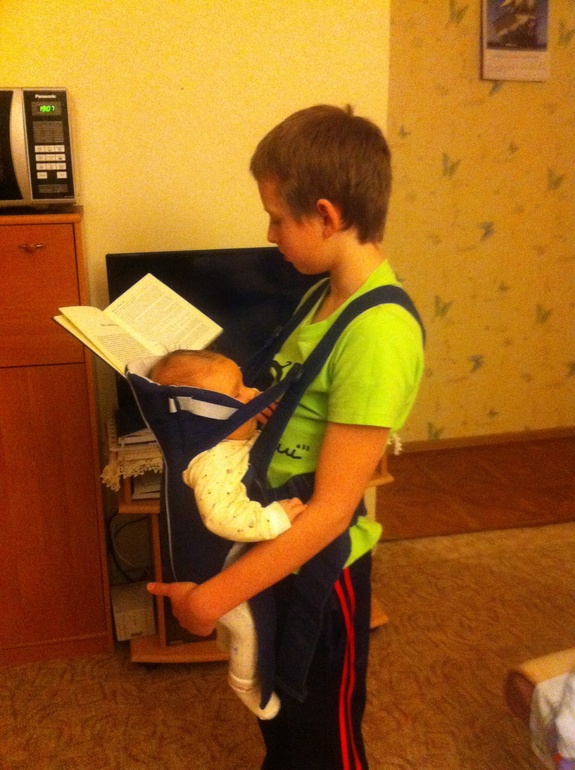 Да, тут Юрику всего 2 месяца, он у нас в этот день с 5 вечера до 10 не спал( измучились, посадили в кенгурятник( тогда еще тонус был, он держал себя), и Тим ходил читал книжку))) а потом смотрим- Юрик уснул)) укачало его) стали перекладывать- он проснулся((( и еще два часа капризулили...