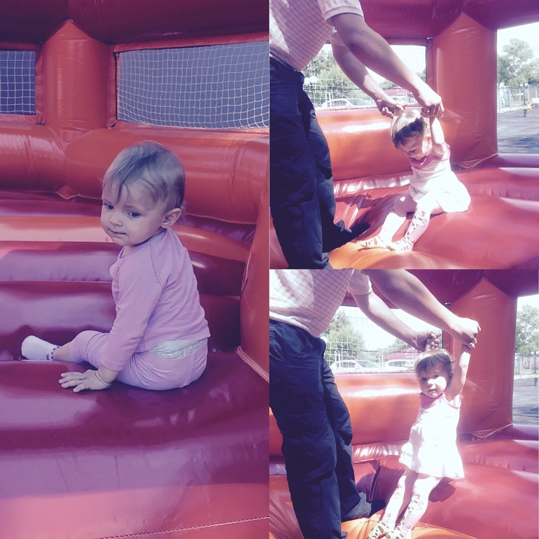 Сегодня были с нашей подружкой Викой в парке, и решили сходить на батут! Викуся была на руках своего отца, так как она трусишка, а Лерочку посадила просто так! Она у меня смелая, но в этот раз ей что то не понравилось и мы начали немного хныкать! Но потом одев ей обувь, она опять захотела на батут, но поняла что лучше не лезть туда и мы пошли на площадку дальше гулять)))
