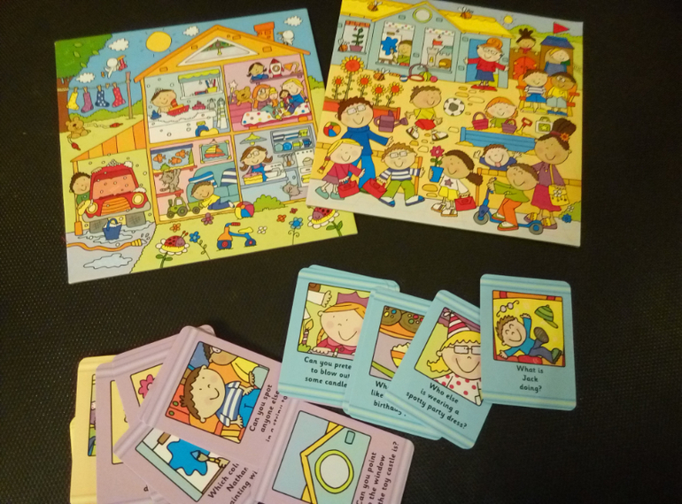 В нем 5 карточек на разные темы и маленькие карточки-вопросы к ним. Сначала мы просто рассматривали большие карты (примерно как виммельбухи). Но годам к 3 прибавили и карточки. Мишка удивился, обрадовался и с удовольствием принял новый вид игры с ними)))