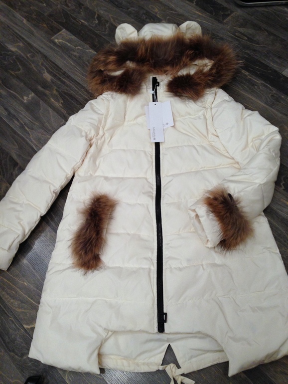 Продаю "перехап". Забавный и в то же время элегантный пуховик с капюшоном и мехом. Цвет молочный. Мех енот. Miss Fo-fo