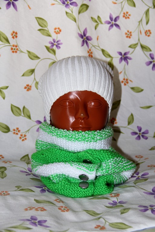 Снуд в два оборота на пуговках. Есть второй ряд отверстий для пуговок на случай, если растянется или нужно будет сделать его поплотнее.