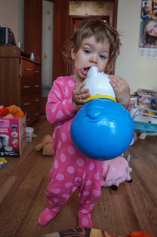 Все также любит играть с мягкими игрушками, рассаживает их рядами на диване, обувает в свою обувь. А вот пупсов, наоборот, раздевает, вообще не терпит, чтобы на них было что-то одето. Еще почему-то до сих пор обожает эту неваляшку, таскает ее за собой по всей квартире: