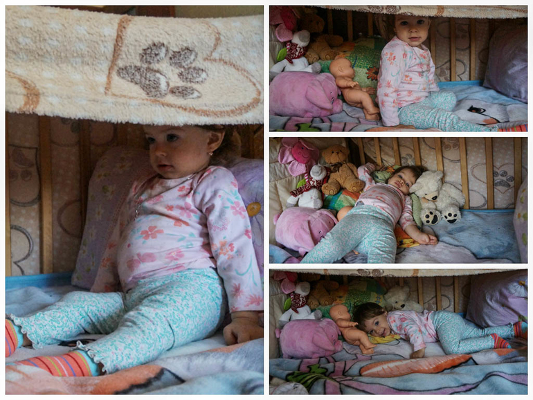 Наряжаться мы ооочень любим)) Достает из шкафа вещи новые, перебирает их, потом мне несет, чтобы одела на нее и сразу к зеркалу бежит)) А вот просто дома голышом предпочитает ходить, у нас жара дикая, мы когда вдвоем, то как нудисты, в одних плавках гоняем))