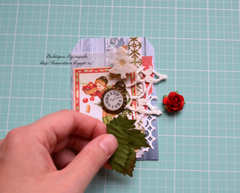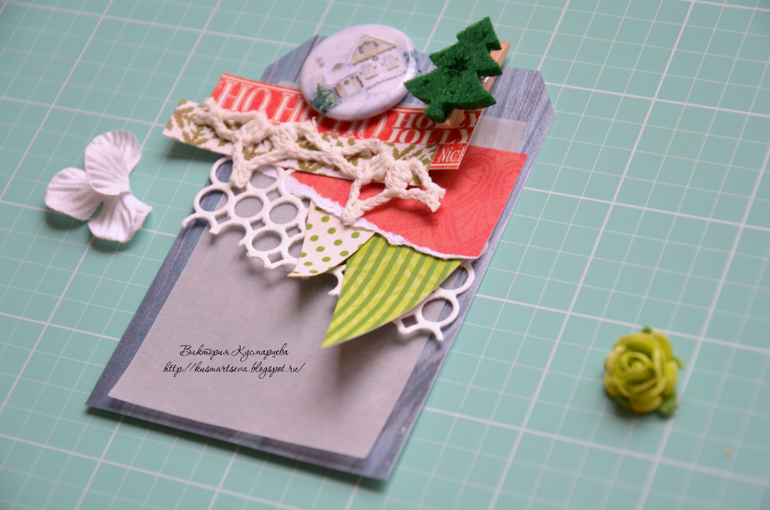 Для декора я взяла остатки вязанной салфеточки, пару плоских цветочков, тайские розочки, деревянные прищепочки с елочками, фишку, подвеску-часики и шнурок)
