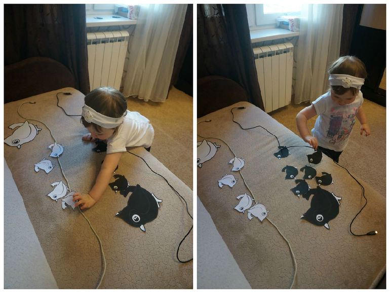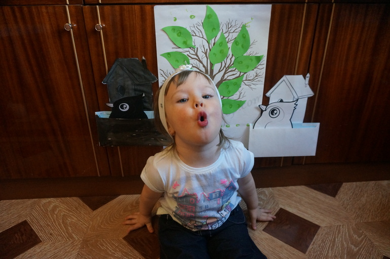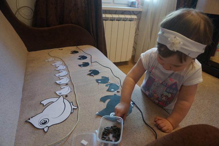 Пока София завтракала, я приготовила в комнате два провода- белый и черный, рассадила птичек по разным углам. задачей Софии было посадить птичек на провода, а так же накормить их семечками. Мы тоже чуток их пощелкали)