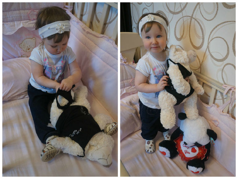 Начали мы с выбора одежды. И как вы могли заметить-это опять брюки и футболка. Одеть платье на мою дочурку стало проблематично, маме надо приложить массу усилий и уловок. Так же кроме СЕБЯ мы нарядили мишку: