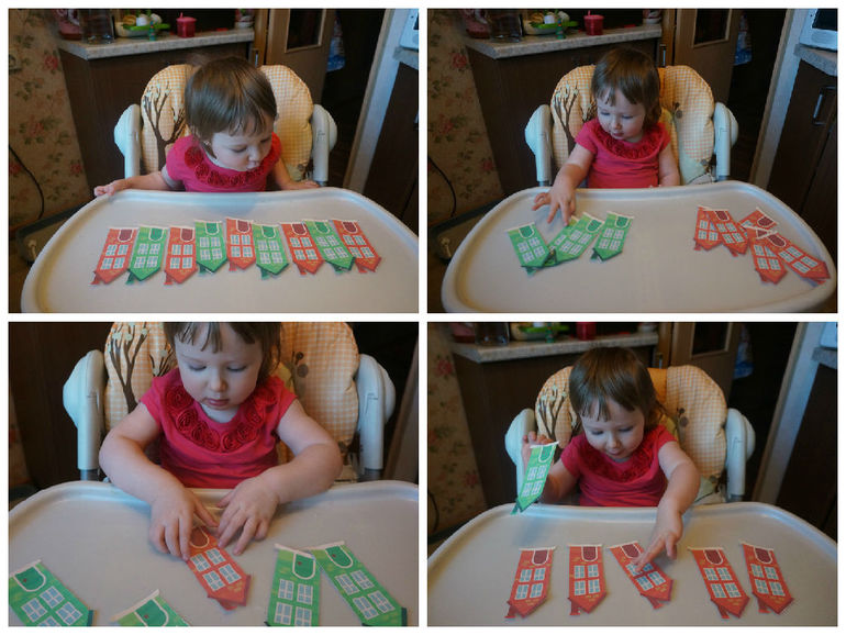 Позавтракав, я предложила Софии рассортировать домики! Сначала мы вместе построили улицу из разноцветных домов. Задание прошло на ура: