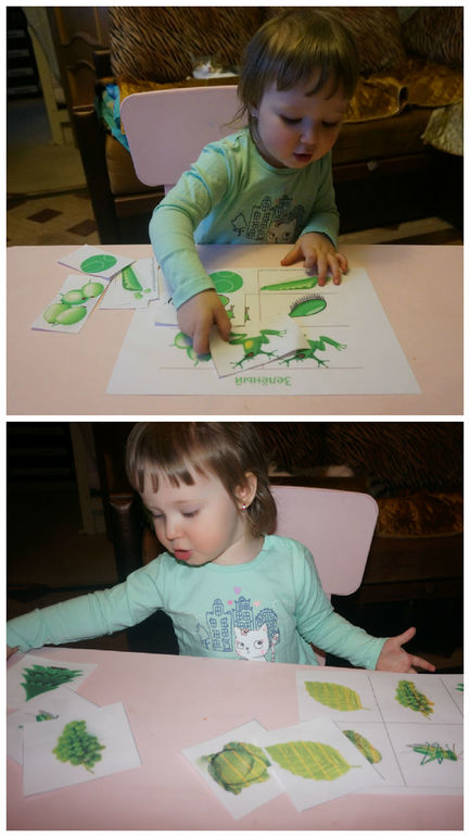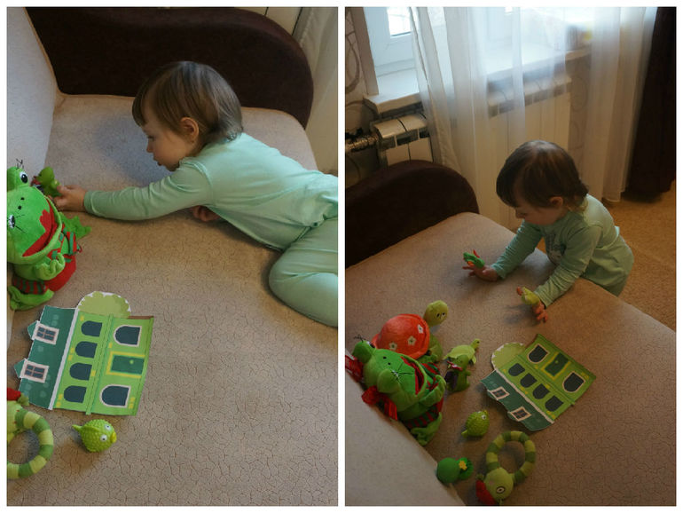 -поиграли в зеленый Теремок. Так как София знает эту сказку наизусть, то мне оставалось только подкладывать ей разные зеленые игрушки, а она сама все рассказывала: